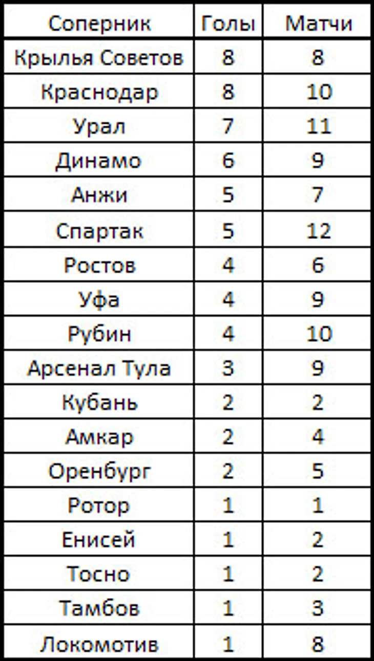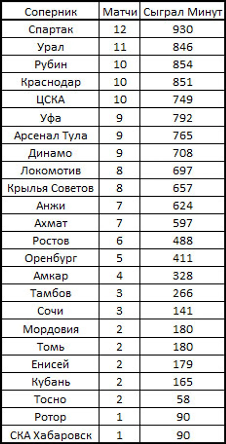 2. Удивительно, но проблемы возникают у Дзюбы не против прямых конкурентов за первую строчку, а с командами, что держатся крепко в середине таблице, Так, за 54 матча против Спартака, Уфы, Рубина, Урала, Сочи и тульского Арсенала, форвард отметился 23 раза, но на каждый мяч ему требуется уже на 4 минуты больше, а именно – 188 минут.