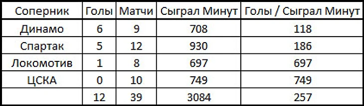 4. Так же, стоит отменить низкую результативность Артёма в противостоянии Москва – Санкт-Петербург. Так, Дзюбе требует на 78 минут больше среднего показателя по Премьер-Лиге, а именно – 257 минут на каждый гол. Всего же было забито 12 голов в 39 матчах.