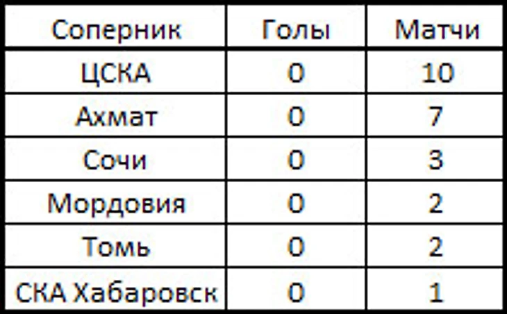 Далеко не все команды успел огорчить Артём Дзюба. Так, сохранить за 6 лет свои ворота в неприкосновенности удалось 6 командам. Из которых стоит выделить московский ЦСКА, что за 10 матчей форвард так и не распечатал, и грозненский Ахмат, 7 матчей и ни одного мяча в воротах.