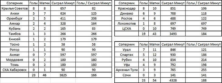 Артём Дзюба поражает ворота соперников в среднем каждые 179 минут. В том случае, если разделить все команды на три категории (по результатам прошлого сезона) – команды зоны еврокубков, команды середины таблицы (7-12 места) и команды зоны вылета (13-16 места + команды вылетевшие в ФНЛ), можно отменить, что: