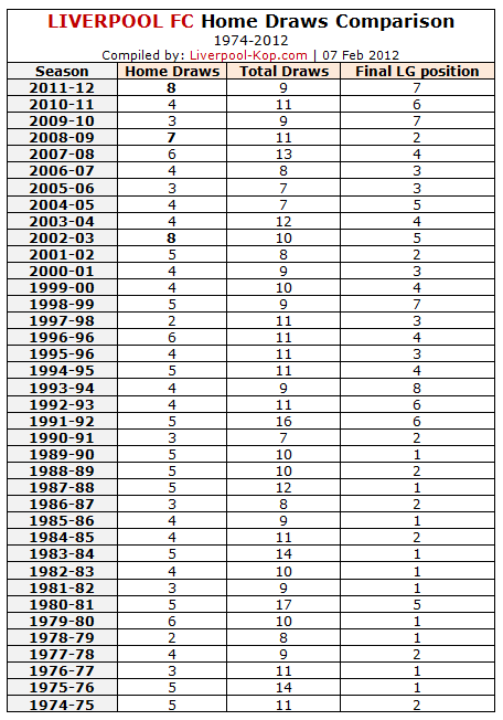 Наиболее убийственный факт: за 120 лет своей истории, "Ливерпуль" никогда не финишировал 4-м, сыграв вничью 8 или более домашних матчей.