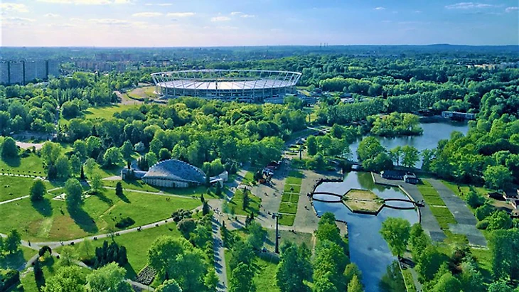 Слёнски парк - самый крупный в Польше и один из крупнейших в Европе городских парков. Фактически, он протянулся от Хожува до Катовице (между городами всего шесть километров). Парк был создан в 1950-ом году, в нём было высажено порядка полутора миллионов деревьев и кустарников. За обилие растительности парк получил прозвище "легких Верхней Силезии". Территория парка долго развивалась и продолжает развивается и по сегодняшний день. Кстати, все объекты, которые мы рассмотрим дальше, также находятся на территории Слёнского парка.