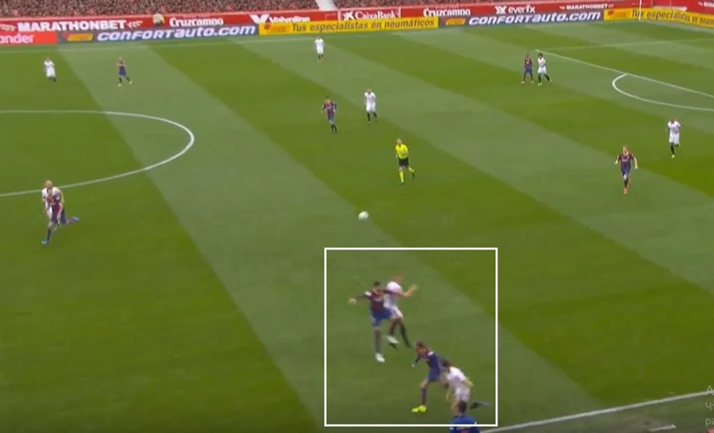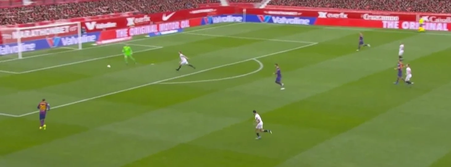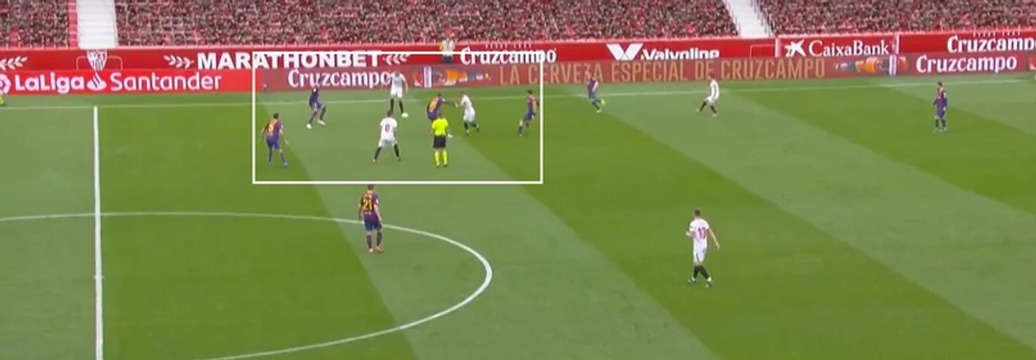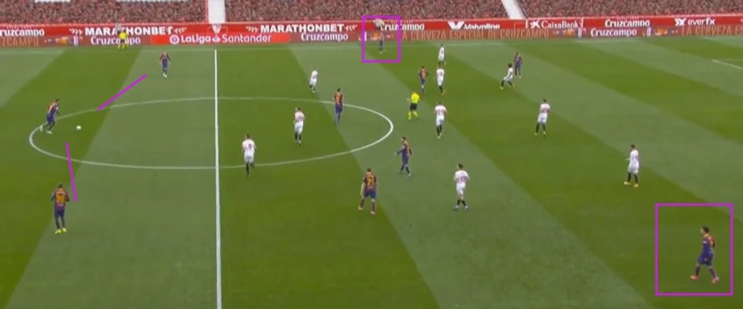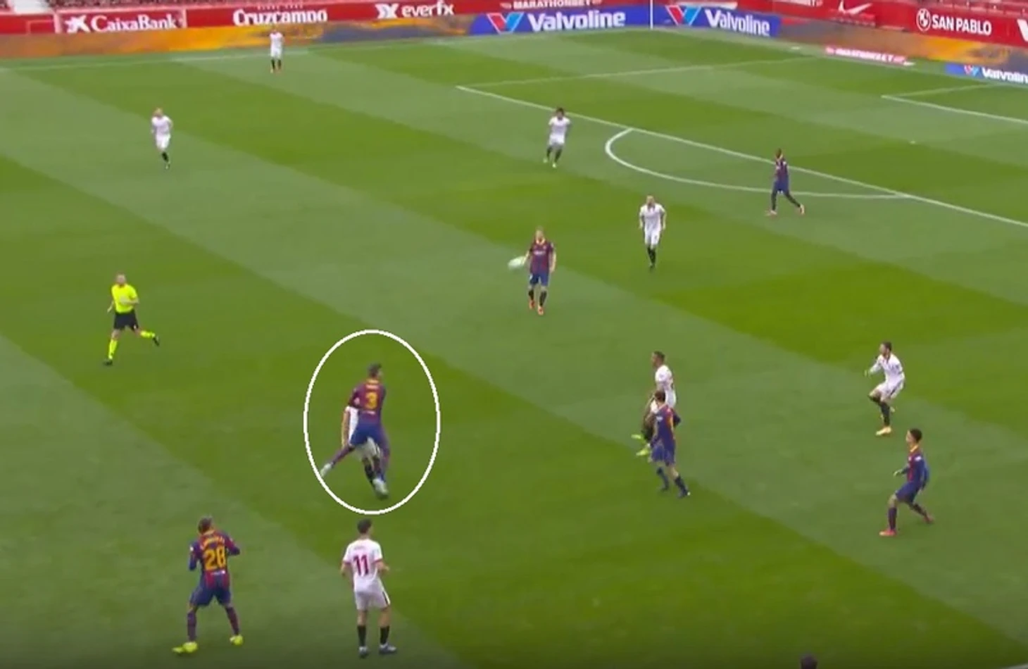 Мингуеза в эпизоде выше замешкается с мячом, но видно, что Пике, отдав передачу, остается свободным. Плюс «Барселоны» и в том, что она адаптировалась по ходу игры: к де Йонгу и Бускетсу, которые чаще действовали в правых полузонах и помогали при выходе из обороны, добавился Месси, что ставило вопросы к «Севилье» при накрытии соперника. В результате «Барселона» 34 % атак провела именно справа, но здесь есть вероятность обмануться — «сине — гранатовые» лишь использовали давление «Севильи» и правый фланг, чтобы качественно выходить через короткий пас в центре поля.