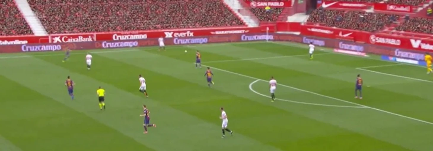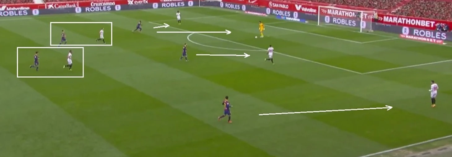 Адаптация номер 2 — это давление «Барселоны». Не секрет, что Навас играет огромную роль в расстановках Лопетеги (4 голевых), поэтому прессинг команды Кумана был направлен так, чтобы «Севилья» переводила мяч направо: