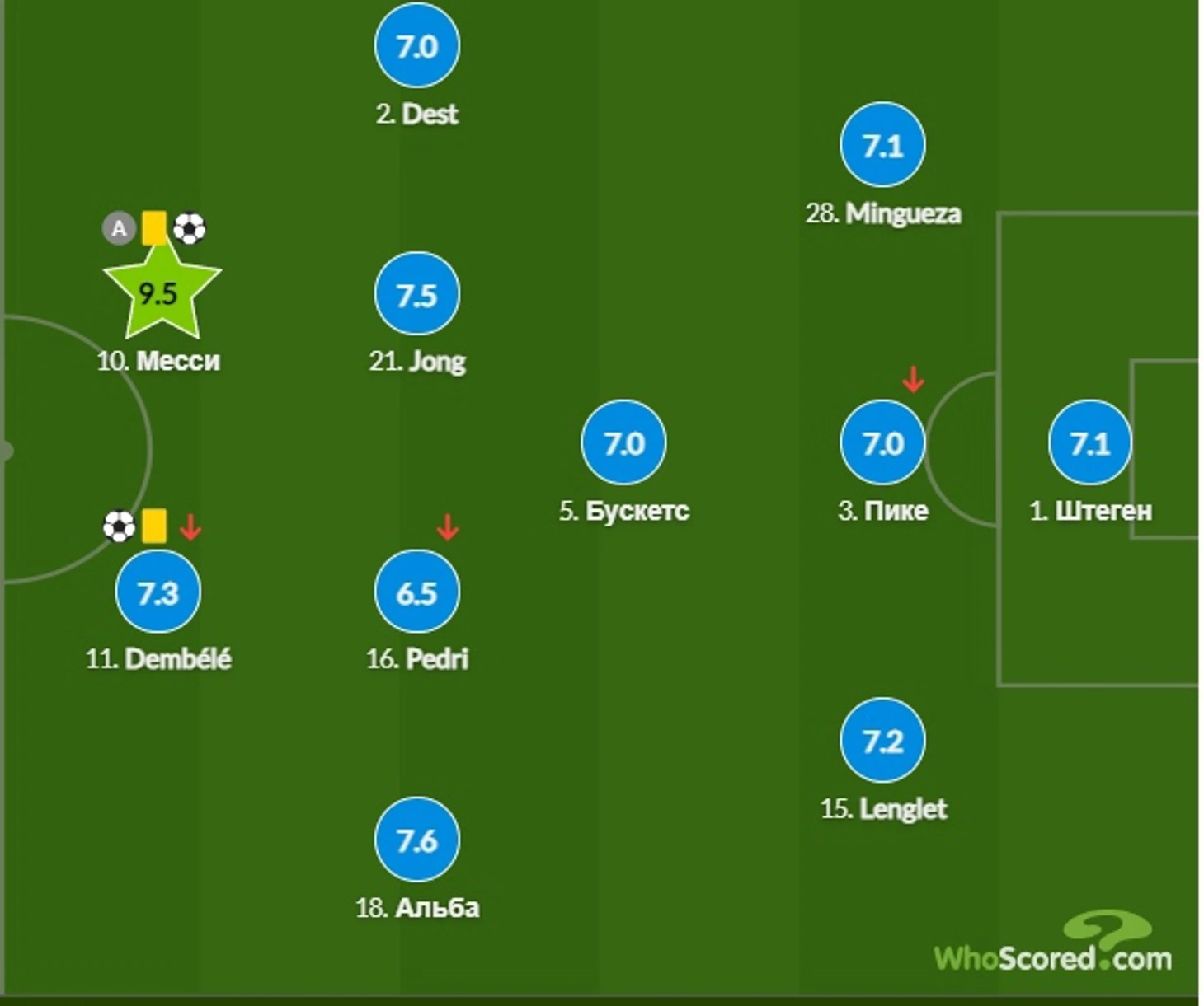 де Йонг или Месси при этом садились к Бускетсу на одну линию с ним в зону правой «6» и оттуда могли продвигать мяч на дриблинге. Дест поднимался в высокую точку справа, слева в такой же привычной манере действовал Альба, что вы и видете на скрине выше.