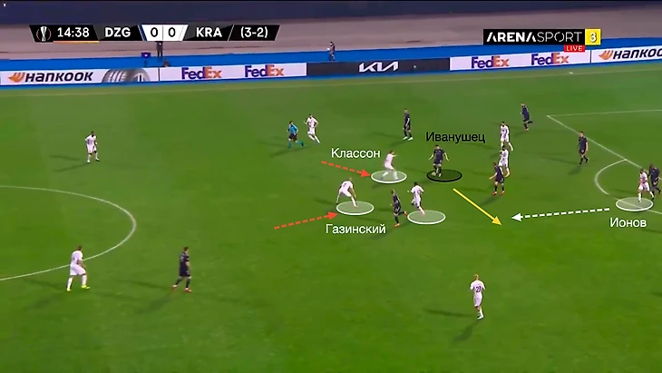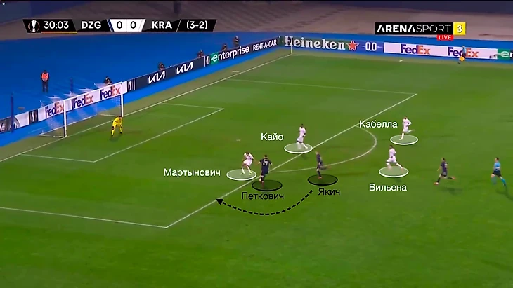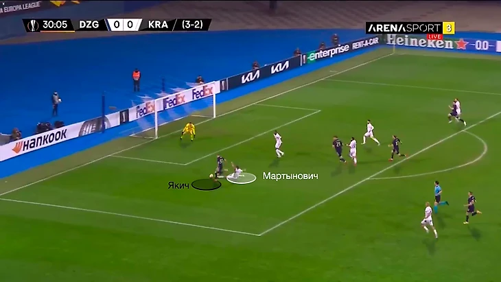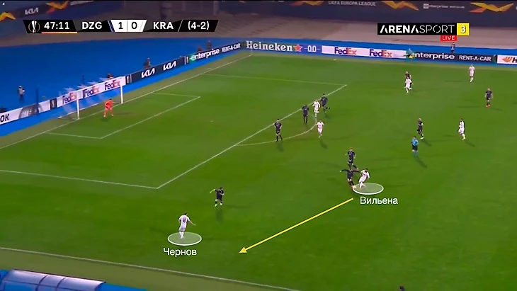 Как только перестаёт проходить игра через центр, «быки» сваливаются на постоянные и не слишком эффективные забросы за спину защитникам. Пробовали такие передачи все – от Газинского до Кайо. Здесь нужно отметить отличную игру, как Ристовски, так и Гвардиола. Они либо сами успевали на перехват, либо оставляли игроков «Краснодара» в офсайде. К тому же, сказывалась отсутствие Берга и его способность зацепиться и сбросить мяч на партнёра. Здесь больше вопросы к самому методу. Одно дело - когда вы используете забросы за спину, чтобы «посадить» тем самым линию обороны и воспользоваться пространством между линий. Другое дело – когда забросы становятся единственным способом доставки мяча в финальную треть. Хорошая работа защитников делает их неэффективными, что и происходило в Загребе.