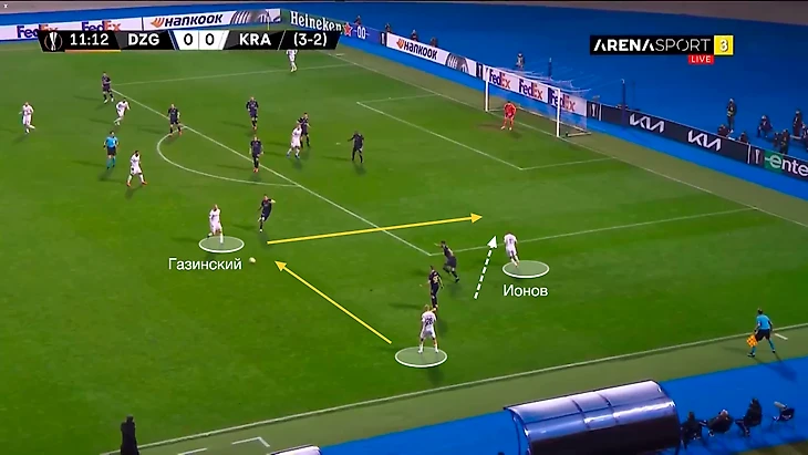 Далее в двух неплохих подходах поучаствовал Ионов, причем на разных флангах. Особенно удачным было взаимодействие с Газинским: