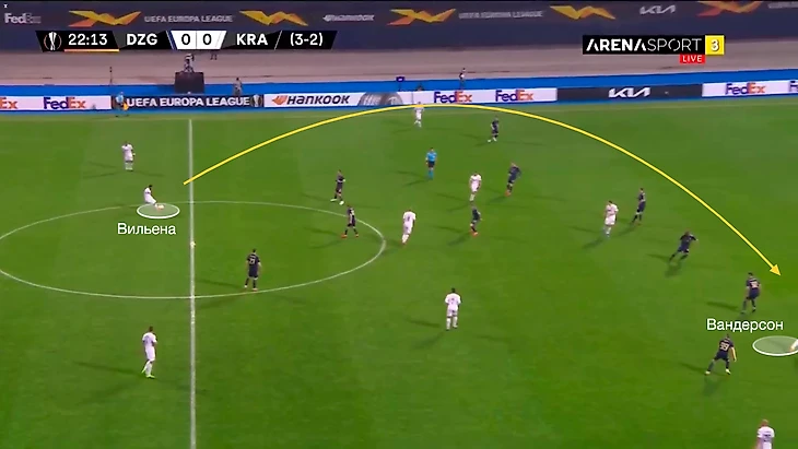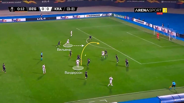 Далее мяч возвращается к Вильене, и тот заряжает его на Вандерсона в офсайд: