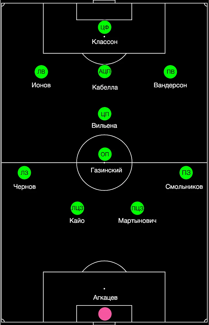 Мурад Мусаев, напротив, внёс заметные коррективы в стартовую заявку по сравнению с матчем в Краснодаре. Главная неожиданность – появление в воротах 19-летнего Станислава Агкацева, несмотря на всю послематчевую защиту Городова. Предсказуемо остался в запасе проваливший первый матч Ольссон, вместо него вышел Газинский. Вандерсон сменил в старте Шапи. Помимо этого, Маркус Берг остался в Краснодаре из-за обострившейся травмы спины – в центр атаки переместился Классон, а его место слева занял Ионов.