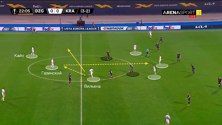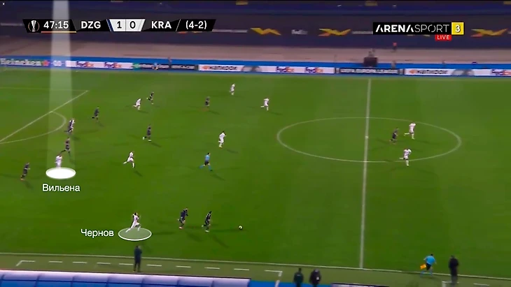 Однако Вильена не возвращает мяч Газинскому, а переводит его Кайо с полной потерей темпа. Обратим внимание, что даже если бы обостряющая передача Газинского в темп не прошла, оба опорника «Краснодара» оставались бы за линией мяча и могли бы вступить либо в немедленный отбор, либо, пласируясь, затормозить встречную атаку – об обрезке речи тут не идёт.
