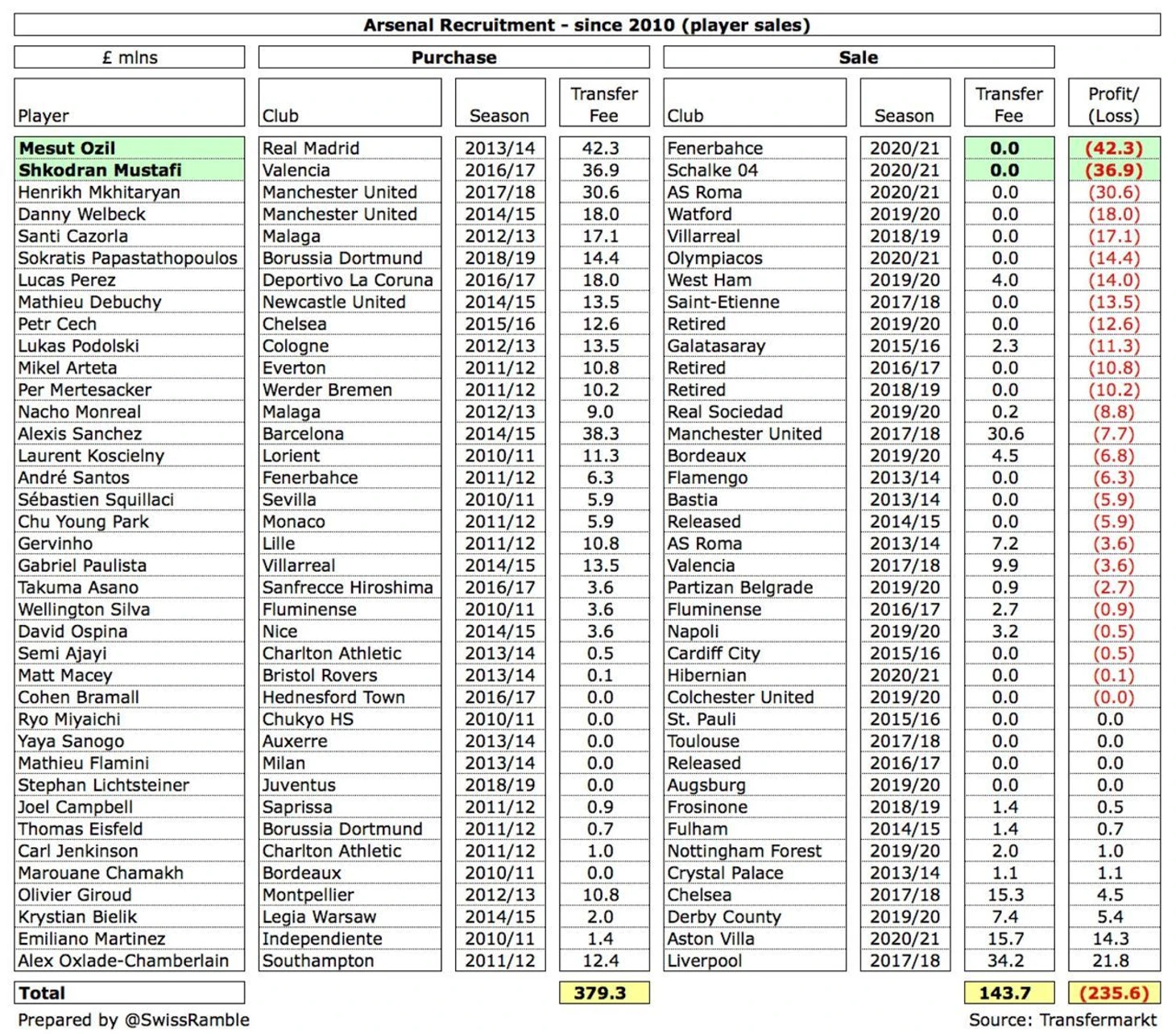 Во-первых, за последние 10 лет «канониры» идут на четвертом месте (да, это место для шуток) по размеру убытка в трансферном балансе. Во-вторых, в это окно они бесплатно отпустили игроков стоимостью около 80 млн евро. Всего же за декаду лондонцы заработали только на 8 перепродажах, остальные трансферы вышли в 0 (5 штук) или принесли убыток (25).