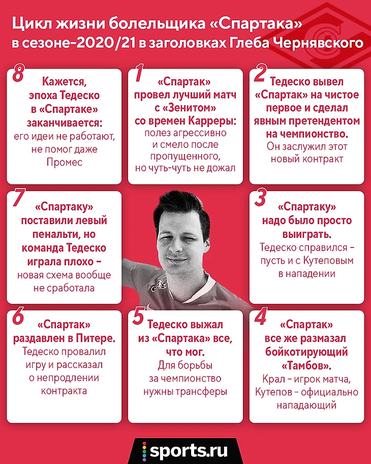 Через четыре года, когда «Спартак» проиграл 12-й матч в чемпионате-2019/20, а Тедеско спрашивали об отставке, Андрей Пономарев обновил цикл жизни «Спартака» через заголовки главного спартаковского летописца на Sports.ru – Глеба Чернявского.
