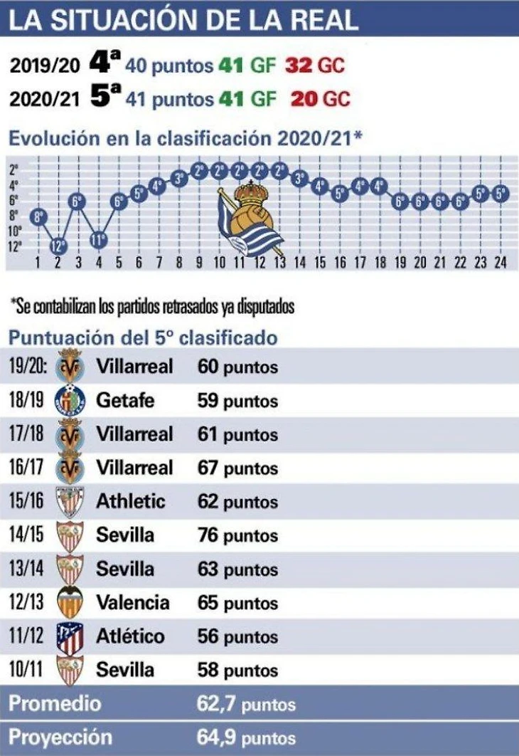 Средний показатель команд, занявших пятое место в ЛаЛиге в конце сезона за последнее десятилетие, составляет 62,7 очка. Если «Реал» сохранит текущий ритм, он достигнет этого количества очков.
