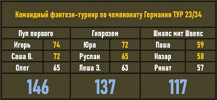 Два оверсемидесятника в составе - залог убедительной победы Пула первого в 23-м туре Германии. Шнапс мит Швепс продолжает днить, причем стал делать это с неприличными отрывами, а не с минимальными, как раньше. Гипрозем старался как мог, но стараний хватило лишь на серебро.
