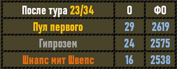 Победа ПП еще больше отдалила их от Гипрозема, но отрыв в 5 очков все еще не кажется непреодолимым. Шнапсиане уже 13 баллов проигрывают лидерам.