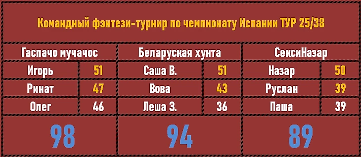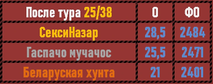 В 25-м туре проснулись ребята из Гаспачо мучачос, Игорь и Ринат сделали все возможное, чтобы отрыв от лидеров общего зачете не увеличился. В итоге СексиНазар бухнулся аж на последнее место.