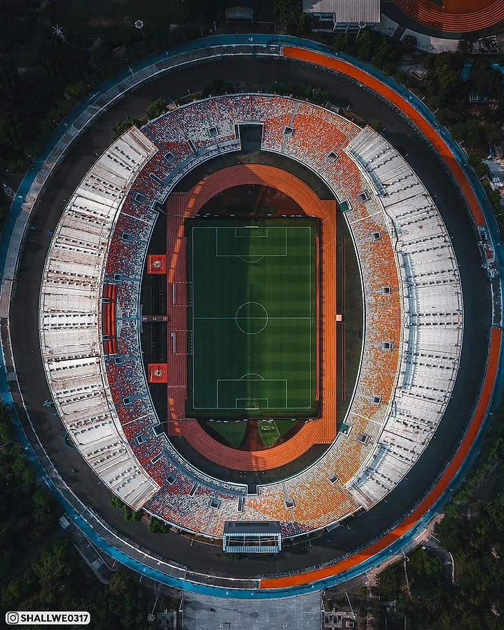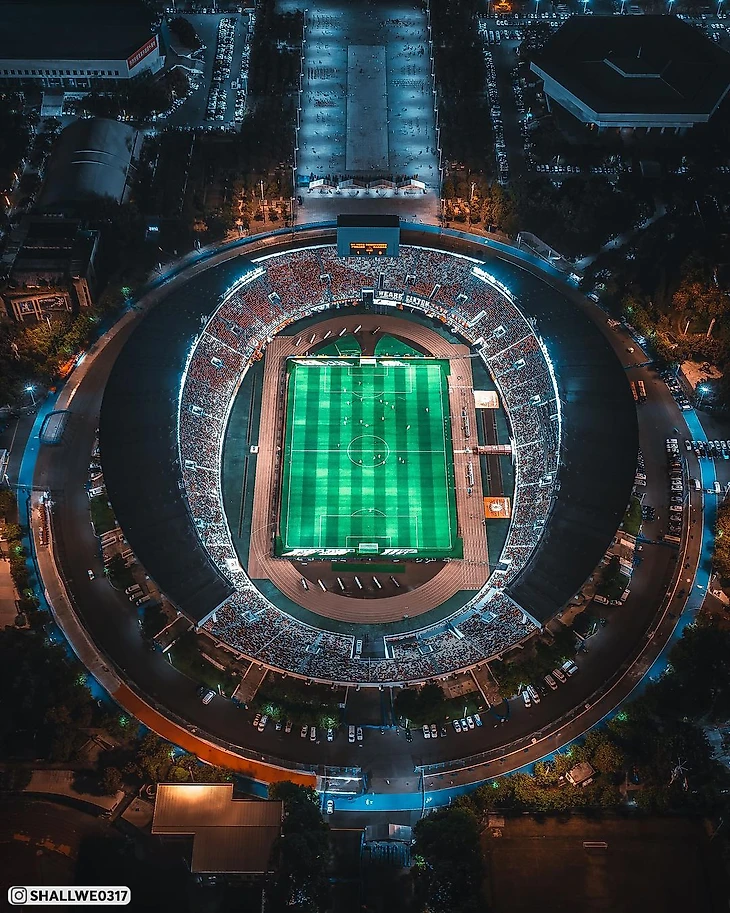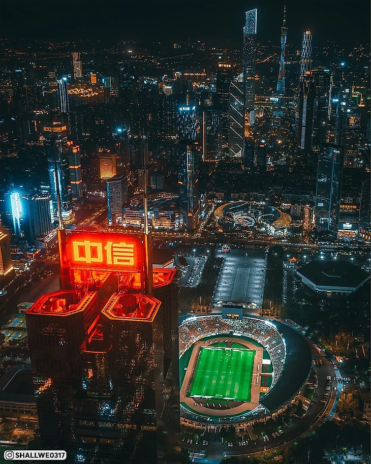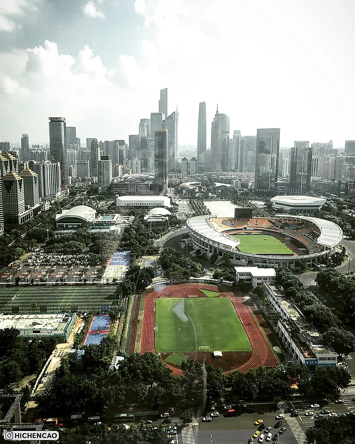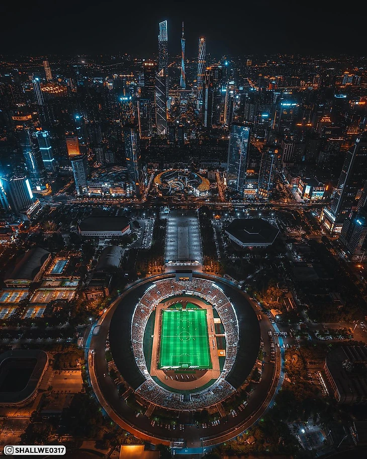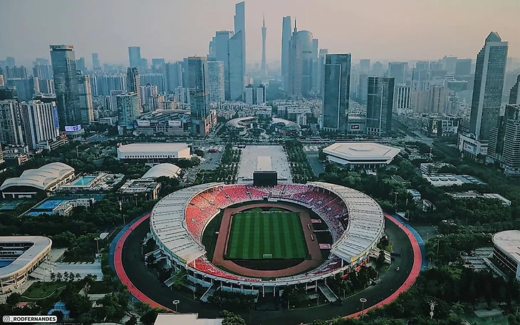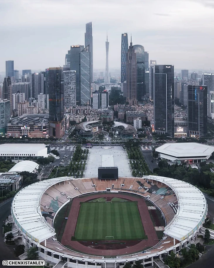 Китайский стадион «Тяньхэ» на 60 000 зрителей посреди небоскребов. Шикарные фотографии с дронов
