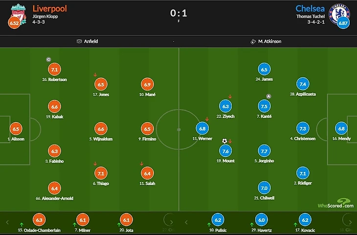 «Ливерпуль» дома уступил «Челси»  и проиграл пятый матч на "Энфилде" подряд. И хотя впервые "красные" пробили в створ ворот только на 85-й минуте, а также пропустили, средние оценки от портала WhoScored для "Ливерпуля" и "Челси" не слишком отличаются.