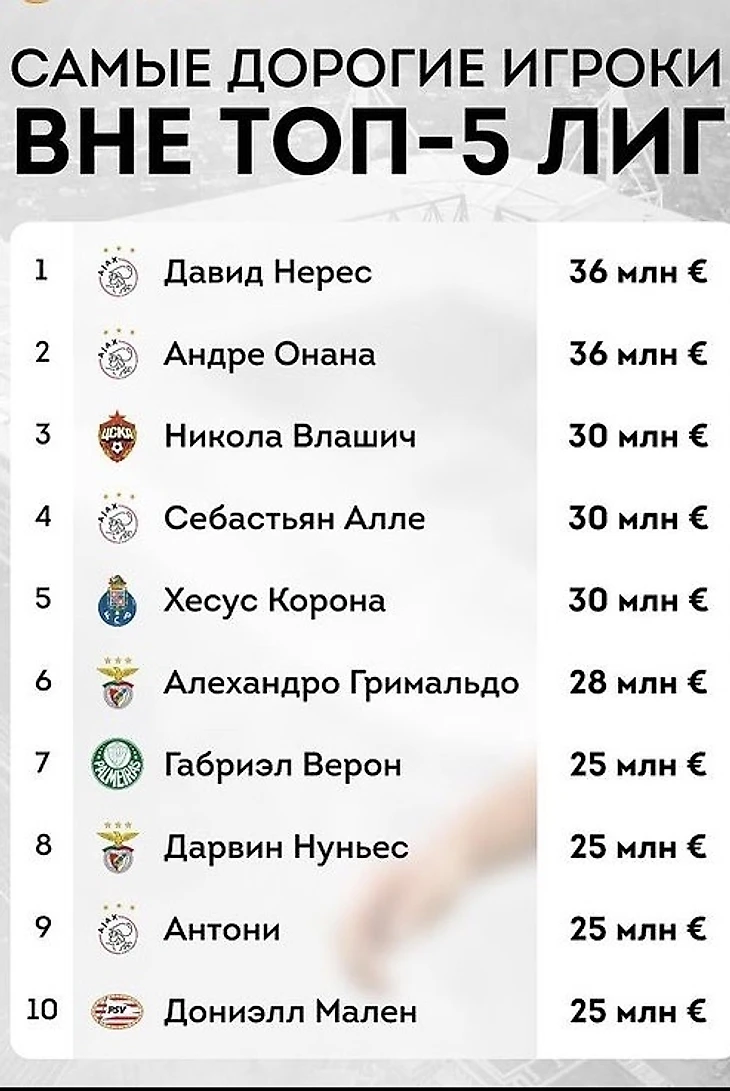 Один из самых авторитетных порталов transfermarkt опубликовал список самых дорогих футболистов, которые не выступают в ведущих европейских чемпионатах.