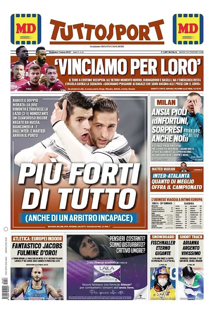С Роналду на скамейке в течение 70 минут, перевёрнут матч с «Лацио» (3:1): готовы к «Порту». Корреа подарил ложную надежду Индзаги, Рабьо и Мората (дубль) перезапустили Пирло. Выиграли также соперники по Лиге Чемпионов. И завтра дело за «Интером». Отличная реакция Бьянконери, которые во вторник в Европе должны отыграть 1:2: разыгрывается четвертьфинал. CR7 раздражён исключением из состава.