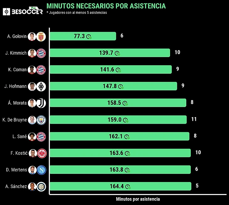 Показатель ближайшего преследователя Головина в лице Джошуа Киммиха из "Баварии" уступает результату лидера почти в два раза - 139,7 минуты на ассист.