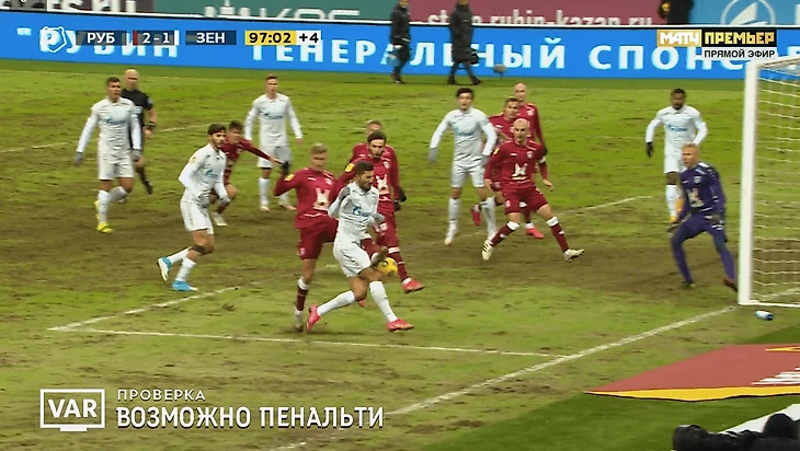 ⏱ 96-я. Сутормин падает в штрафной «Рубин» после столкновения со Старфельтом. Карасев снова врубает ВАР – пенальти!