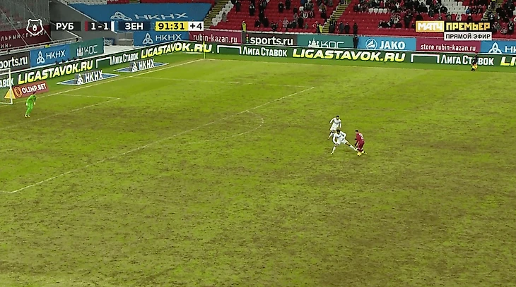 ⏱ 91-я минута. «Зенит» с 70-процентным владением и 22 ударами (у «Рубина» на тот момент 10) давит, но нарывается на контратаку.