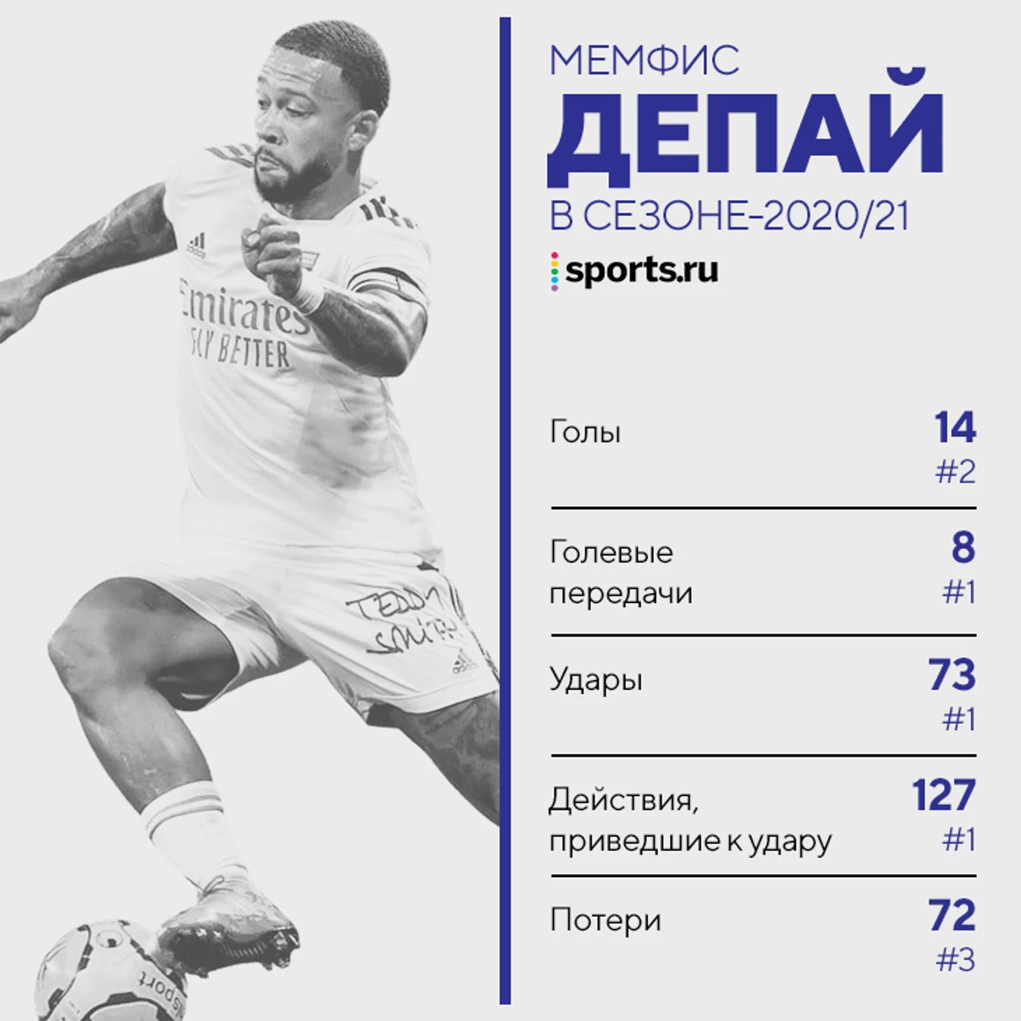 У провала Депая есть тактическое объяснение. В «ПСВ» Мемфис был игроком с самым высоким usage rate (процент владений команды, которые закончились действием конкретного футболиста) во всей лиге – 19%. Высочайшая производительность Мемфиса соседствовала с малой эффективностью – тот случай, когда игрок берет количеством, а не качеством. Все три центральных полузащитника (Вейналдум, Гуардадо, Махер) чаще всего пасовали именно Депаю.