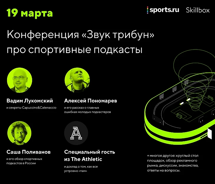 19 марта Sports.ru при поддержке компании Skillbox проведет онлайн-конференцию «Звук трибун», посвященную особенностям спортивных подкастов. Послушать лекторов и задать им вопросы можно будет бесплатно и без регистрации: достаточно будет присоединиться к телеграм-каналу «Звук трибун», и уже оттуда переходить по ссылкам на трансляции.