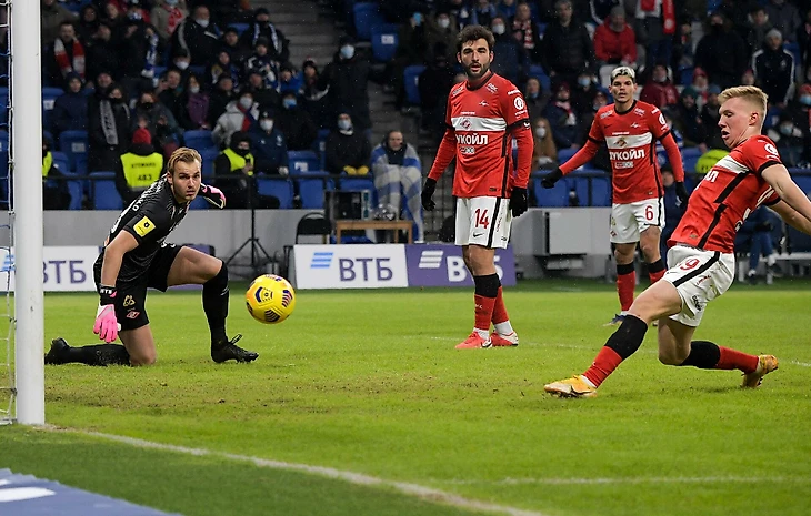 Соболев отлично отыграл не только в единоборствах за мячами - он лучший игрок матча без всяких сомнений (и это несмотря на прекрасную игру Максименко, к которому мы ещё вернёмся). Изумительная, тонкая, точная и своевременная передача на Витю Мозеса и есть первый гол команды! Великолепное видение поля в этой ситуации от форварда. Далее был удар на точность и немножко не повезло Саше. В этой игровой ситуации уже Алекс Крал сыграл филигранно, зряче отдавая под удар Соболеву. Во втором же тайме - уверенное исполнение пенальти и к голевой передаче добавлен личный гол. Кстати, Соболев становится штатным пенальтистом "Спартака". Невольно в очередной раз напрашиваются аналогии с питерским пенальтистом...