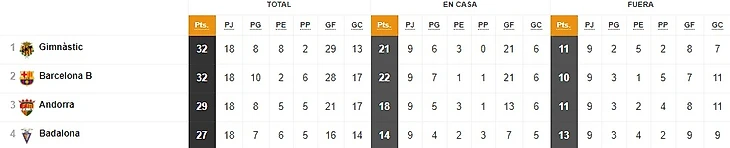 За 2 матча до завершения первого этапа «Барса Б» сравнялась по баллам (по 32) с «Настиком» и уступает ему по личным встречам. На 3 балла от дуэта лидеров отстает «Андорра», на 5 - «Бадалона».