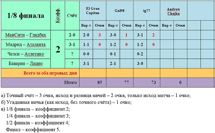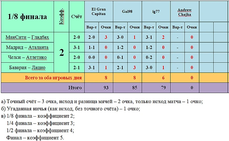 На самом деле всё совсем не так, как кажется сегодня очень интересный игровой день. Гостевой матч Атлетико против Челси - вполне мог бы стать украшением полуфинала (как минимум!), да и Лацио, имхо, показывает очень симпатичную игру. Вобщем, сегодняшние игры мало кого оставят равнодушным!