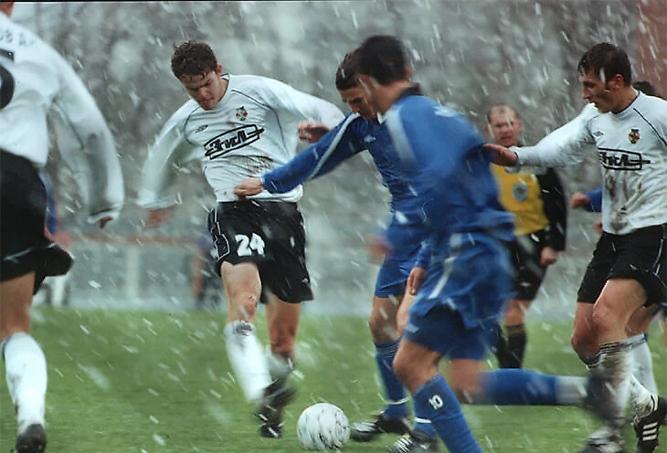 А ЦСКА выиграл легендарное снежное дерби. Матч задержали на 20 минут, чтобы расчистить поле (техники не было, все лопатами), но это не помогло: играли почти в сугробах.