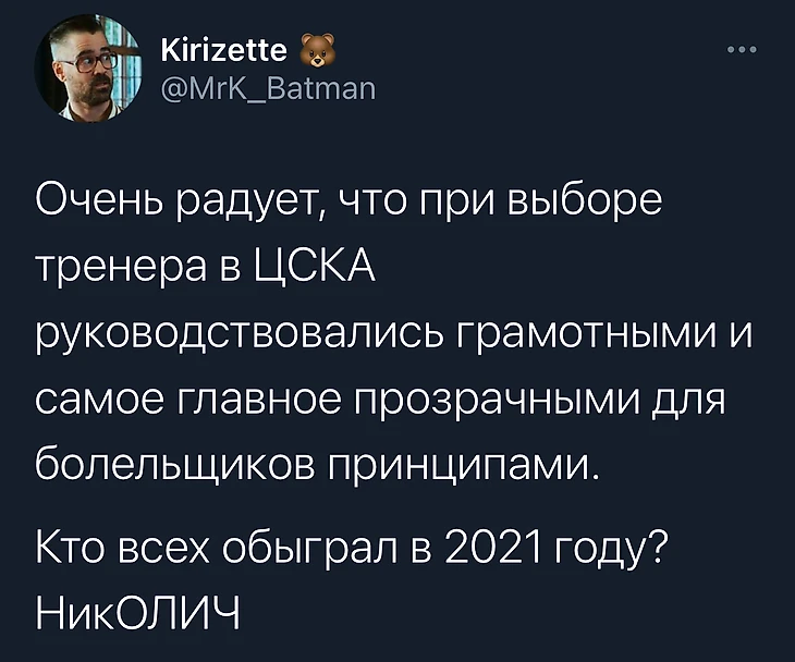 Значит ли это все, что Олич и ЦСКА уже обречены на совместный провал? Конечно же нет. Возможно, у Олича есть с собой интересные идеи и представленный план работы с командой (он же был?) так впечатлил руководителей ЦСКА, что они сделали свой выбор, закрыв глаза на все кричащие риски.