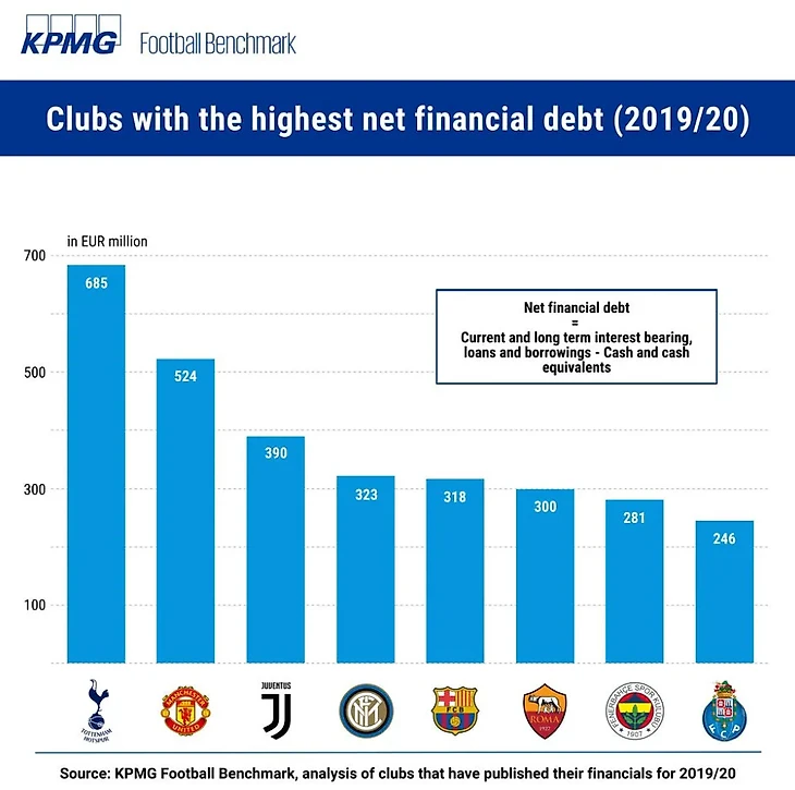 «Ювентус» (390 млн евро), «Интер» (323 млн евро) и «Барселона» (318 млн евро) замыкают пятерку клубов с наибольшим объемом долгов в прошлом сезоне.