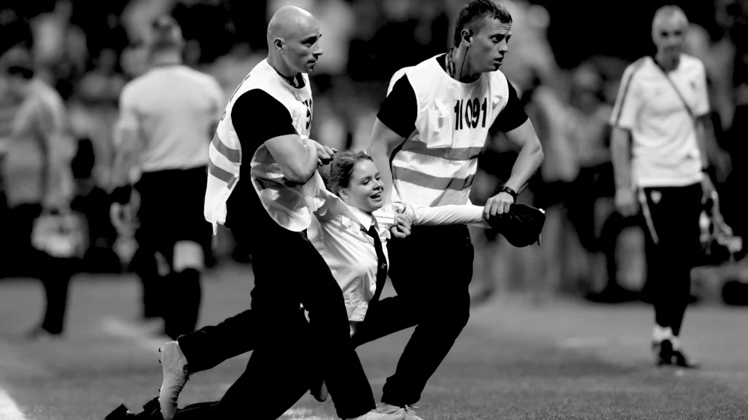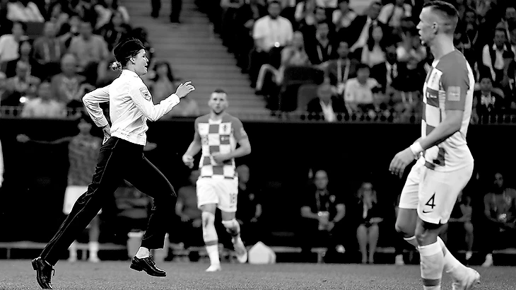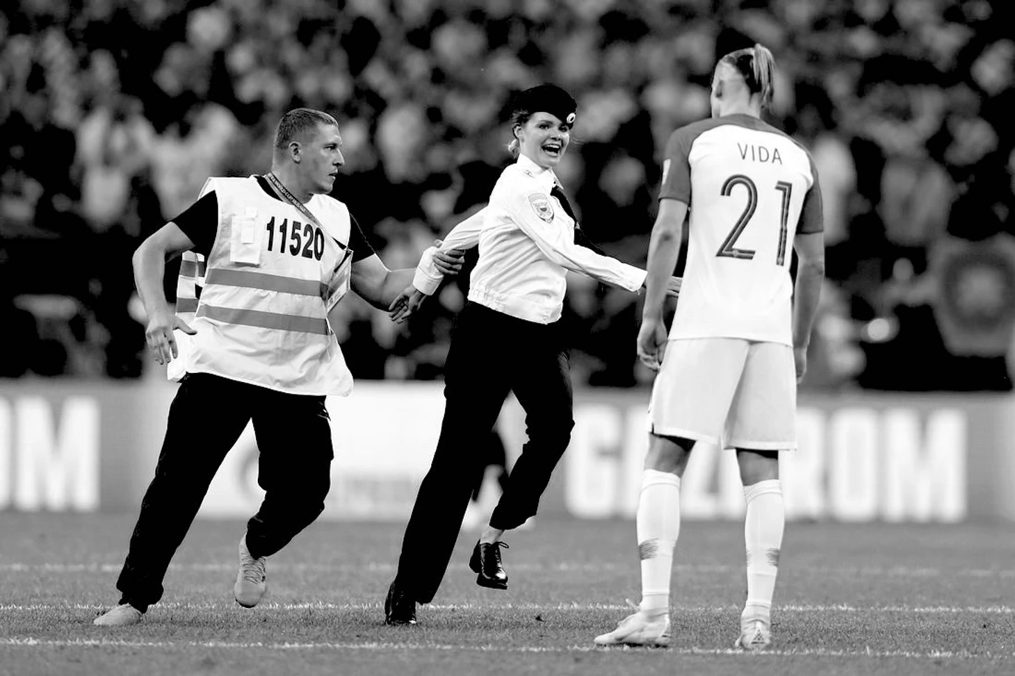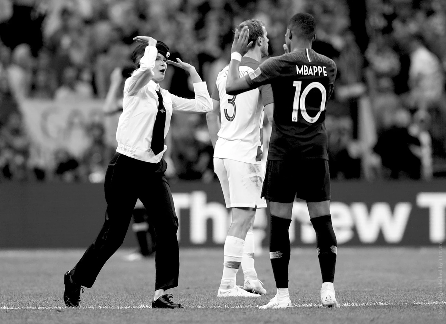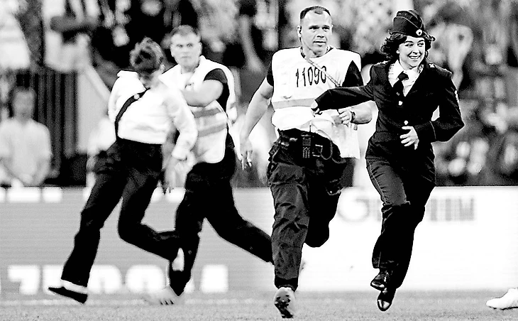 И в тот самый момент, когда мосье Президент всеми своими французскими манерами отмахивался от назойливой балканской бабы Колинды, на поле начался остроумный, дерзкий и очень смешной перформанс «Милиционер вступает в игру» в исполнении панк-группы Pussy Riot и примкнувшего к ним Петра Верзилова, затмивший собой сам матч.