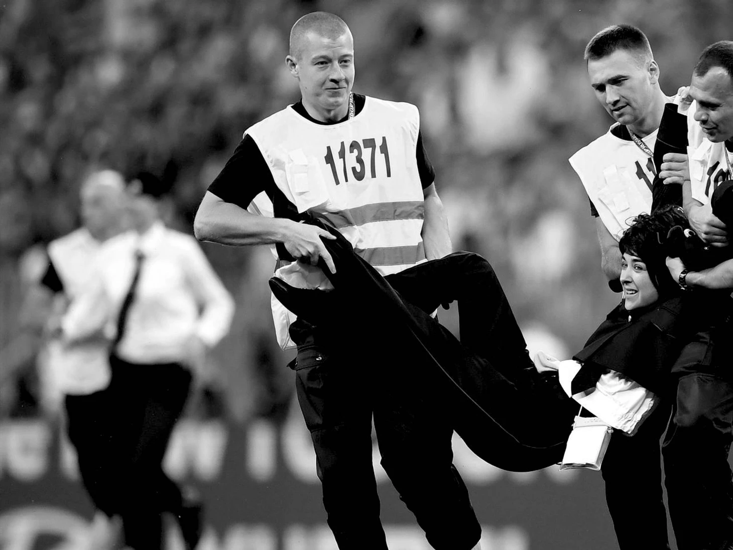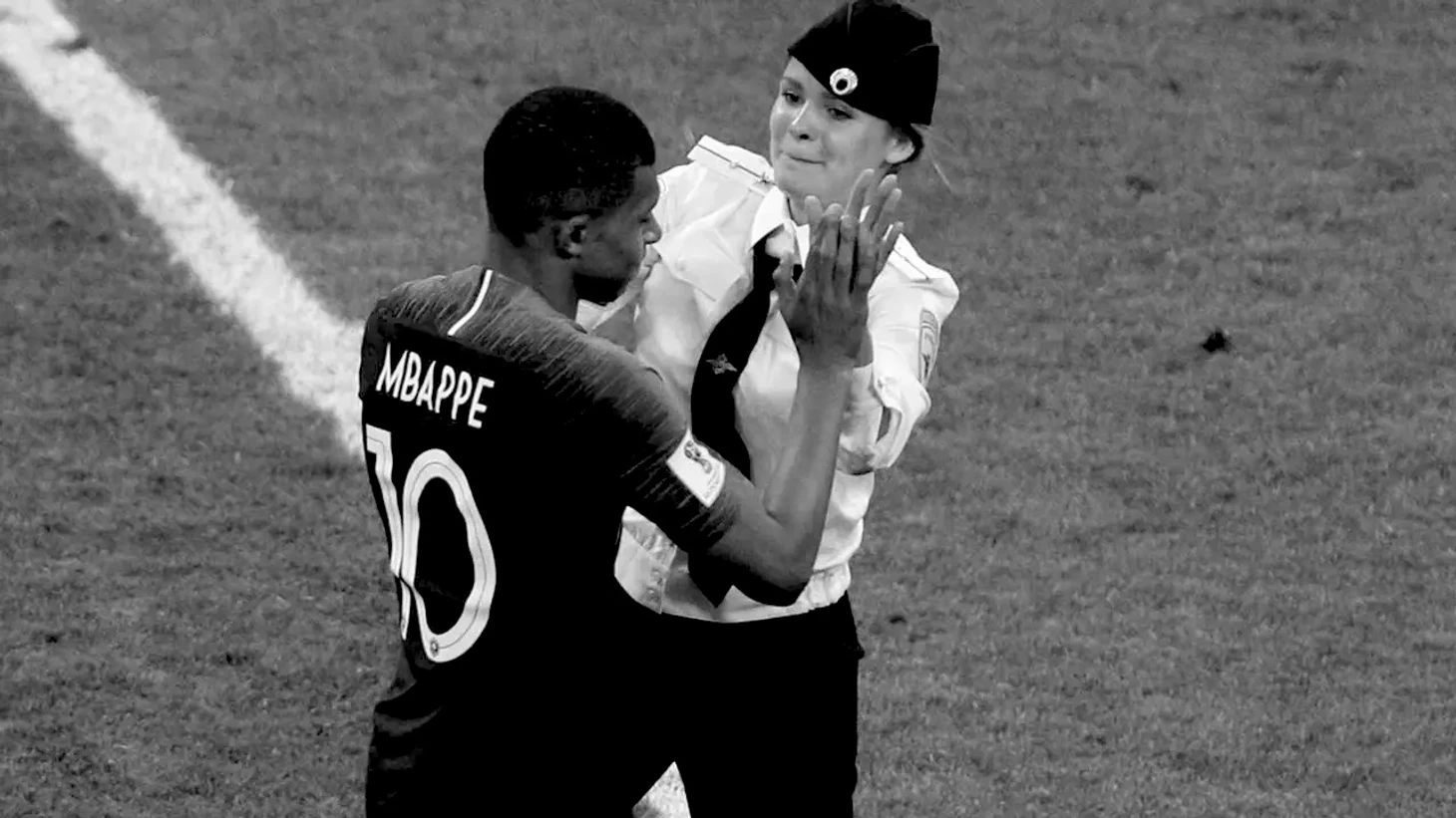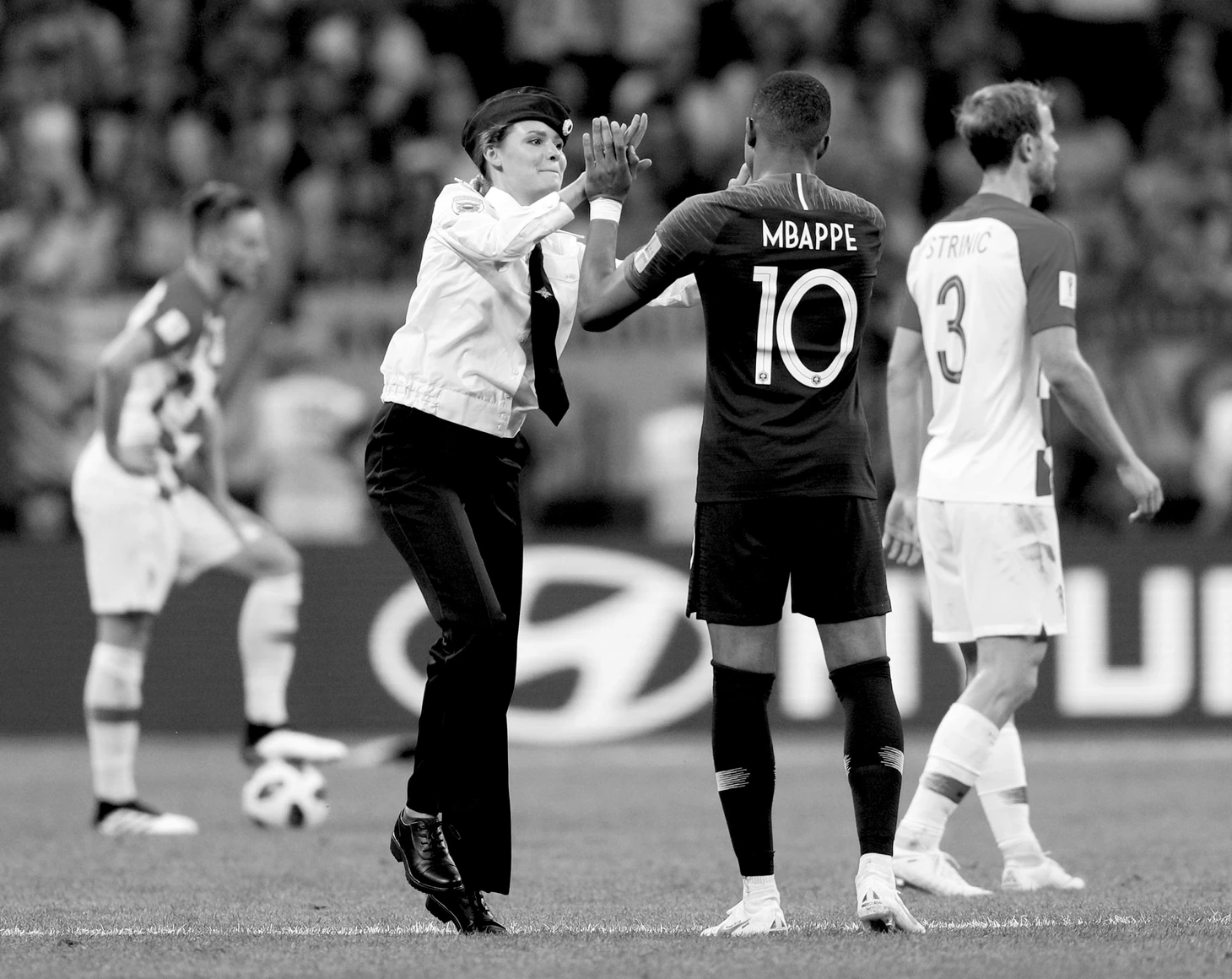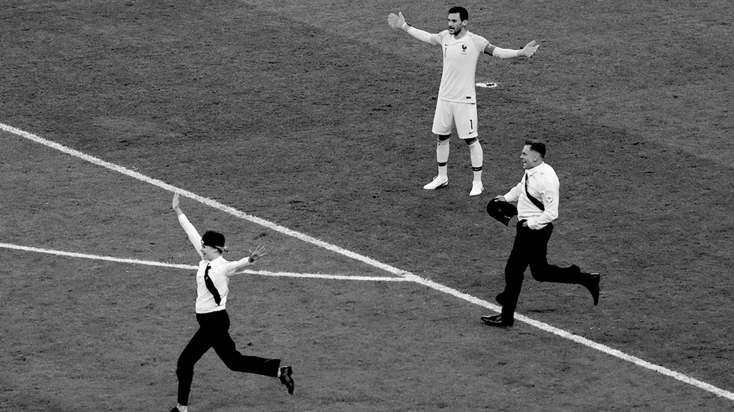 И в тот самый момент, когда мосье Президент всеми своими французскими манерами отмахивался от назойливой балканской бабы Колинды, на поле начался остроумный, дерзкий и очень смешной перформанс «Милиционер вступает в игру» в исполнении панк-группы Pussy Riot и примкнувшего к ним Петра Верзилова, затмивший собой сам матч.