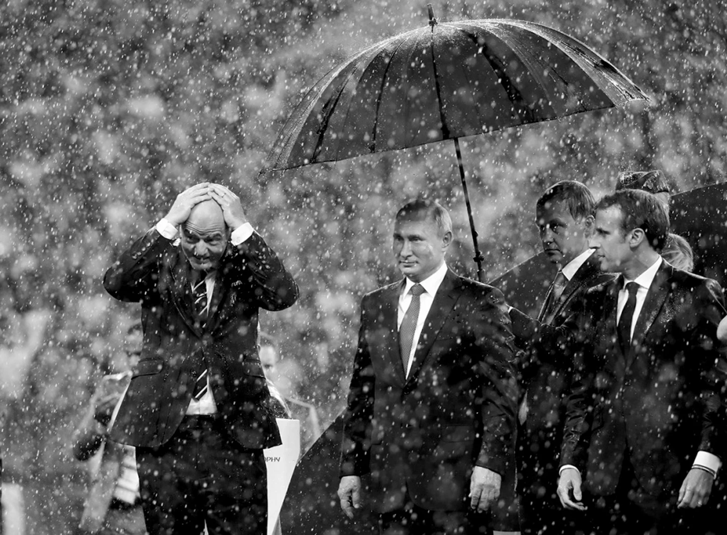 Дьявол кроется в деталях, и этой деталью в финале Чемпионата стал зонт, обычный зонт, который безотказно сработал в нужный момент, раскрыв свои широкие поля над головой президента Путина, и словно вырезал его из драматической телевизионной картины эпического ливня, под которым остались мокнуть до трусов Джанни Инфантино, президент Макрон и так и не протрезвевшая премьер Грабар-Китарович, лобызающая совсем уже ничего не понимающего Килиана Мбаппе.
