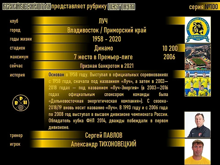 В ближайшее время выложу ссылки на все остальные 99 выпусков, если они кому интересны. Но с другой стороны - история наша скорбная. К юбилейному выпуску я решил дать вам самый свежак - совсем недавно владивостокский клуб был признан банкротом, и даже если власти Приморья захотят его воскресить, то в ближайшие 4 года имя Луч для них будет недоступно.