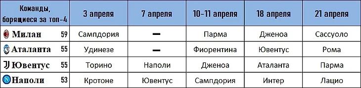 У «Милана» действительно отличные шансы войти в четверку по итогам чемпионата: в концовке сезона у команды всего два грозных соперника – «Ювентус» и «Аталанта». Но даже на этот случай чуть что у миланцев есть шестиочковый отрыв.