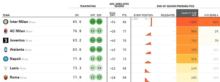 Рискну предположить, что «Милан» и вовсе закрепится на втором месте. Кстати, проекция портала FiveThirtyEight со мной согласна. Подробнее про модель можно прочитать здесь.