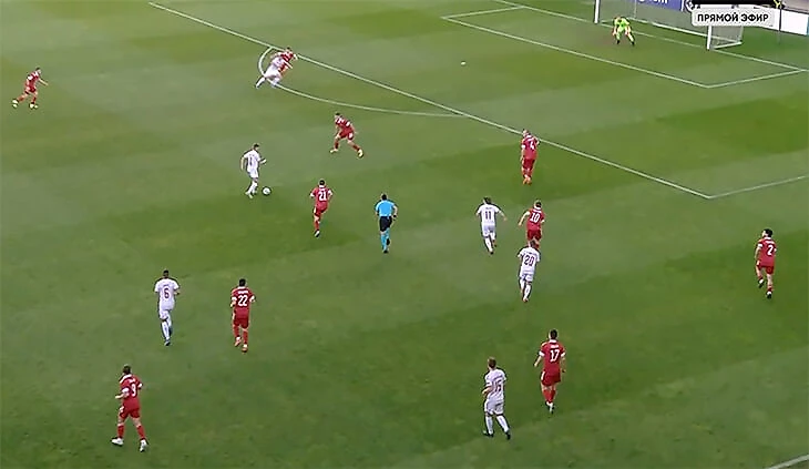 Тут Дивеева уже обыграли вчистую, один в один. Линдстрем нашел клиента: просто прокинул мимо Игоря. А Андерса Дрейера из «Мидтъюлланда» не смог накрыть капитан молодежки Иван Обляков.