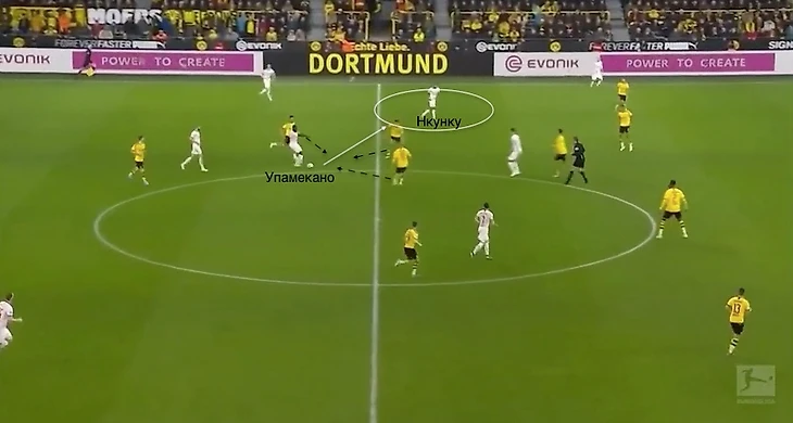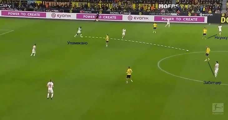 На него среагировали полузащитники «Боруссии», освободив Нкунку и Забитцера. Пас пошел на открытого Нкунку.