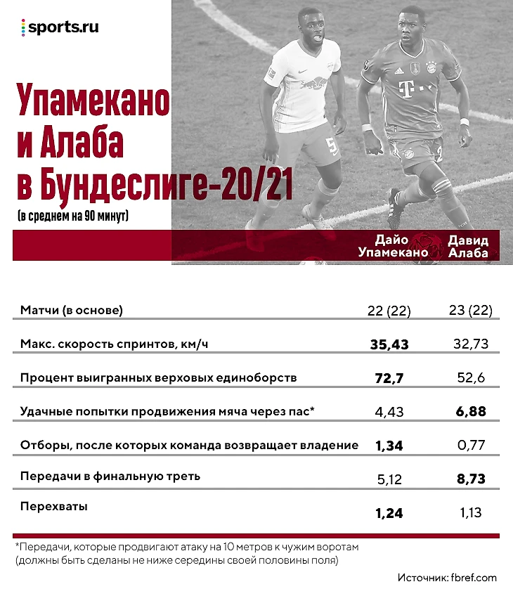 Хотя в сравнении с топ-защитниками его возраста (U-23), играющими в топ-5 европейских лигах, Упамекано по итогам прошлого сезона попал в тройку лидеров по количеству удачных продвижений мяча через пас (13 передач в среднем за игру) и дриблинг (2,2 обводок). Его обошли только Бенуа Бадиашиле («Монако») и Абду Диалло («ПСЖ»). Алаба просто делает это на совсем запредельном уровне.