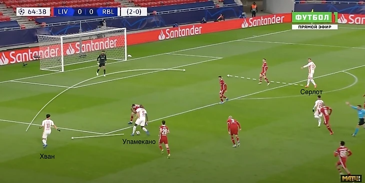 А вот свежий пример, когда Дайо помог в атаке. Ответный матч 1/8 ЛЧ «Ливерпуль» – «Лейпциг» в марте. В середине второго тайма высокий прессинг и необходимость отыгрываться с 0:2 вынесли центрального защитника Упамекано аж к углу чужой штрафной.