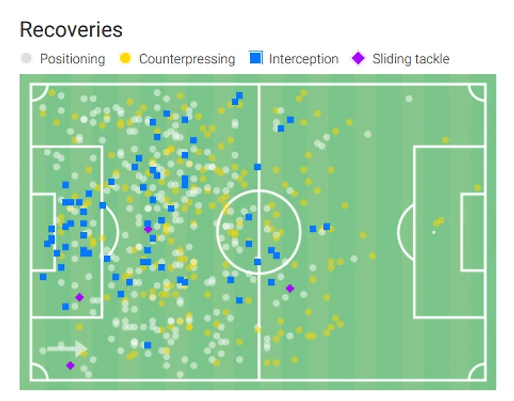Заметная часть оборонительной работы француза проходит далеко от своей штрафной. Синими точками обозначены перехваты.