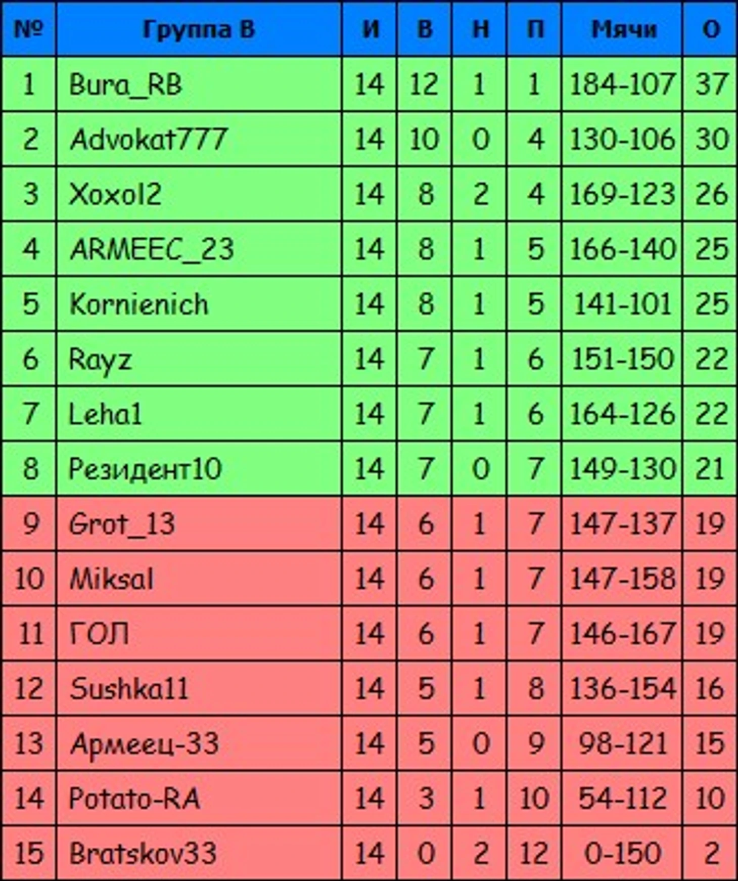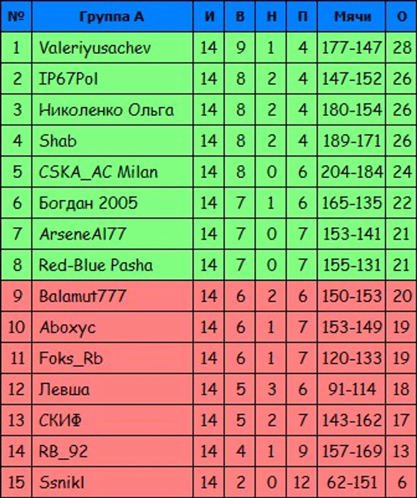 Ниже - итоговые показатели участников в группах: