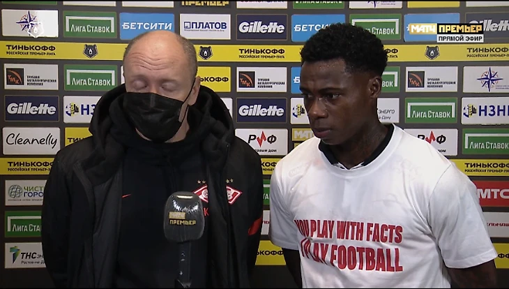 В перерыве, Квинси Промес появился на флеш-интервью в майке с надписью «Вы играете с фактами, я играю в футбол». Скорее всего, это было своеобразным ответом на фильм Матч-Тв о нем. Справедливости ради, голландец ответил: во втором тайме отдал голевую передачу с углового на Соболева.