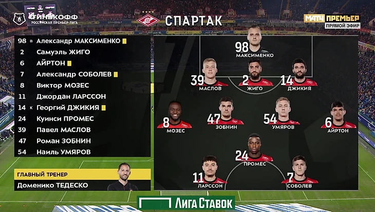 Спартаковцы забили первыми, не без помощи рикошета отличился Виктор Мозес. Ошибку Песьякова в этом моменте можно увидеть только, если очень сильно предвзято отнестись к эпизоду: плотный удар, после рикошета, вратарь пойман на противоходе. Вдобавок ко всему мокрый газон не способствует быстрой смене направления движения… Для нигерийца это уже 3-й гол в 13-ти играх в футболке «Спартака».