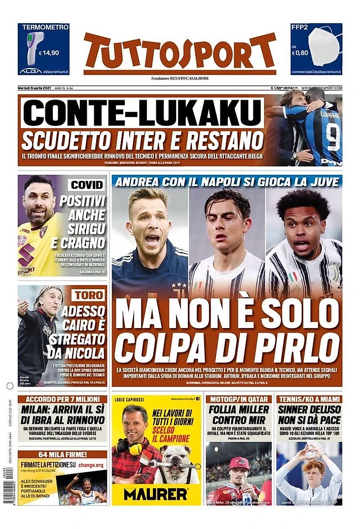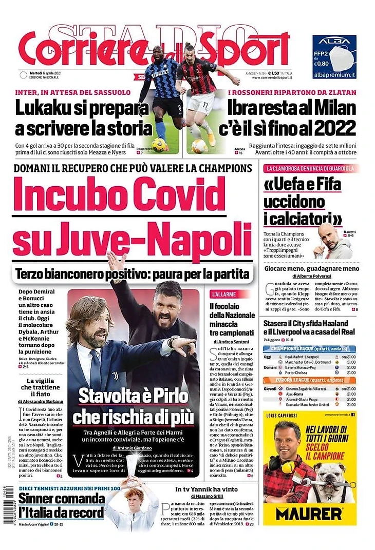Кошмар Ковида для «Юве»-«Наполи». Заголовки Gazzetta, TuttoSport и Corriere за 6 апреля